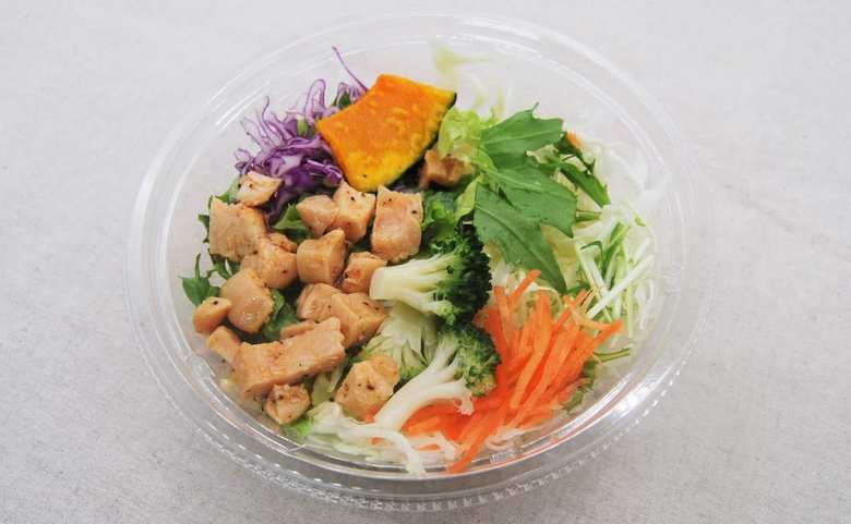 「スモークチキンとたまごのシーザーサラダ」は、147キロカロリー。“ロカボ”商品なのに意外とチキンが肉厚で満足感があります。