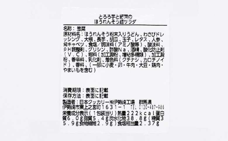 ローソン「とろろ芋と野菜のほうれんそう麺サラダ」は、222キロカロリー。ヘルシーな和風サラダをお探しの方におすすめのサラダです。