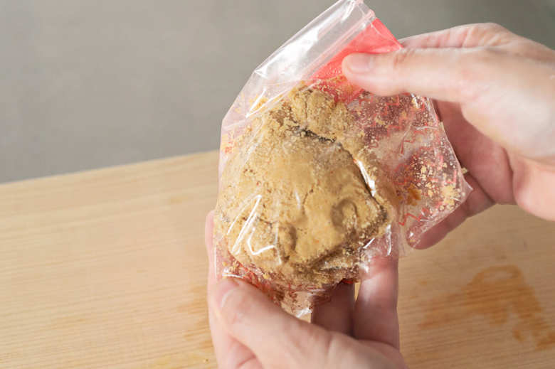 プラスチックの保存容器でもいいのですが、ジッパー付きバッグだとこのように上から揉み込むことができて便利。漬け終わったあともそのまま処分できます。