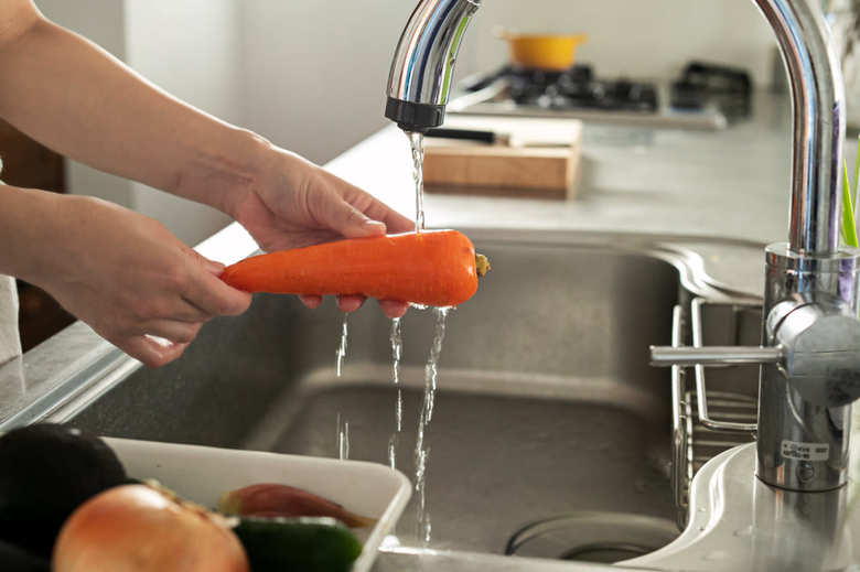 ①皮のある野菜は皮をむき、流水で洗う