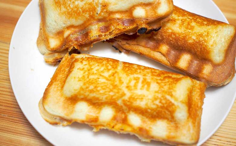 使い方は至ってシンプル。食パンを載せてお好みの具材を載せたら、プレートを閉じてロックを掛けてガスコンロで焼いていきます。加熱時間の目安は片面ずつ弱火で2~3分。両面をしっかり焼きましょう。