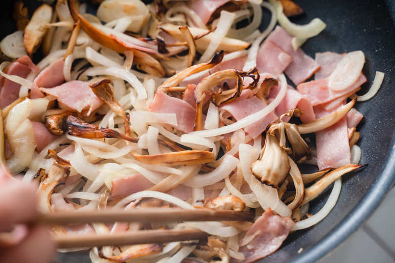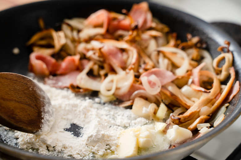 ③②にバター(10g)を加え、玉ねぎ、ベーコン、塩、黒こしょうを入れて、玉ねぎがしんなりするまで炒める。