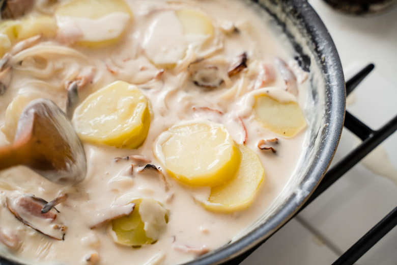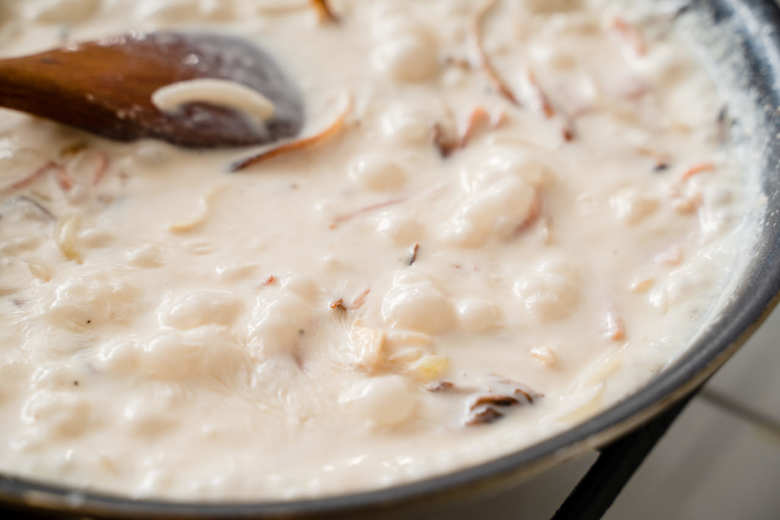 お次は、ホワイトソースの海に、じゃがいもとナツメグを入れて、混ぜ合わせます。