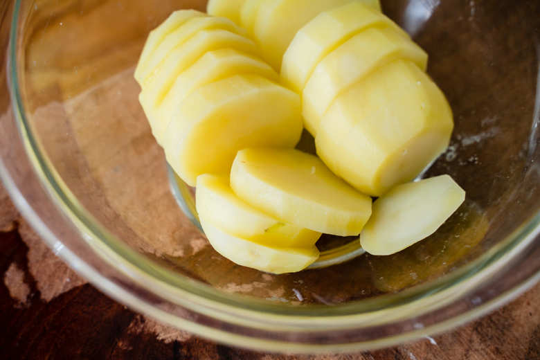 ①エリンギとまいたけを手で割いて、平ざるに並べて天日に半日ほど干す。玉ねぎは繊維に逆らって薄切りにする。ベーコンは1㎝幅に切る。じゃがいもは皮をむいて1㎝幅の輪切りにし、耐熱ボウルに水大さじ2(分量外)と一緒に入れてラップをかけ、電子レンジ(600W)で8分蒸す。