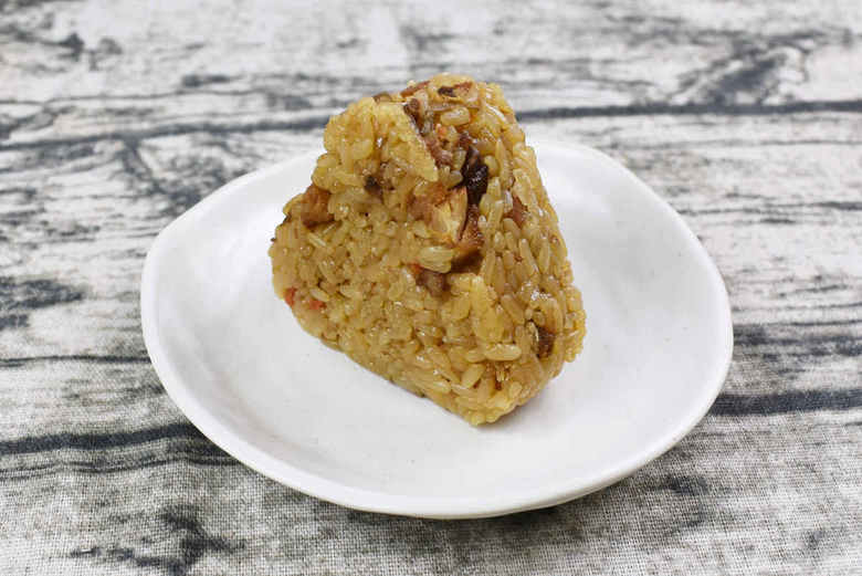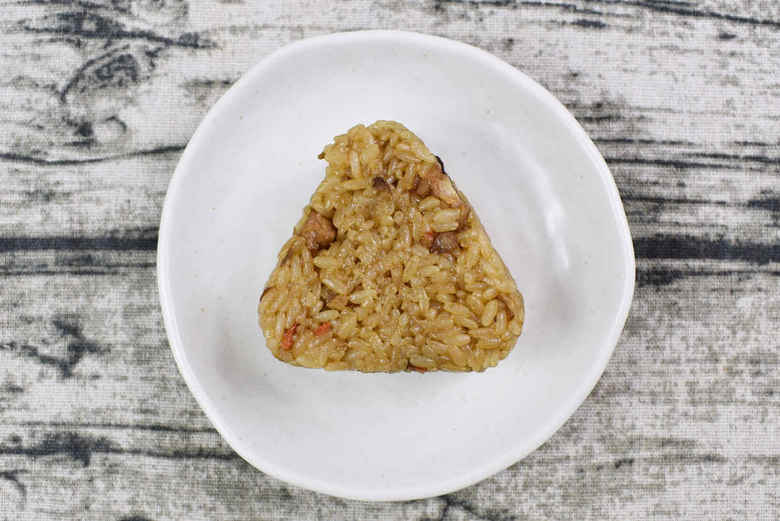 ブラウンカラーに染まった「阿波尾鶏の五目おこわ」は、オーソドックスな三角形のおにぎりです。パッケージを開封すると、醤油たれのこうばしい香りが立ち上がってきました。具材には味つけ鶏肉、にんじん、しいたけ、ごぼうなどが入っています。旬の具材が混ぜ込まれているのは嬉しいポイント。