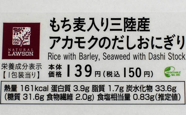 ナチュラルローソン「もち麦入り三陸産アカモクのだしおにぎり」は161キロカロリー
