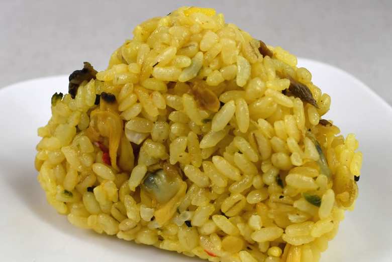 ナチュラルローソン「もち麦入りパエリア風おにぎり」の袋を開けてみると、さっそくにんにくの香りが鼻を通過。お米は黄色く炊き上がっており、とても華やかなカラーリングです。おにぎりの見た目や匂いは、完全にパエリアを再現していますよ。