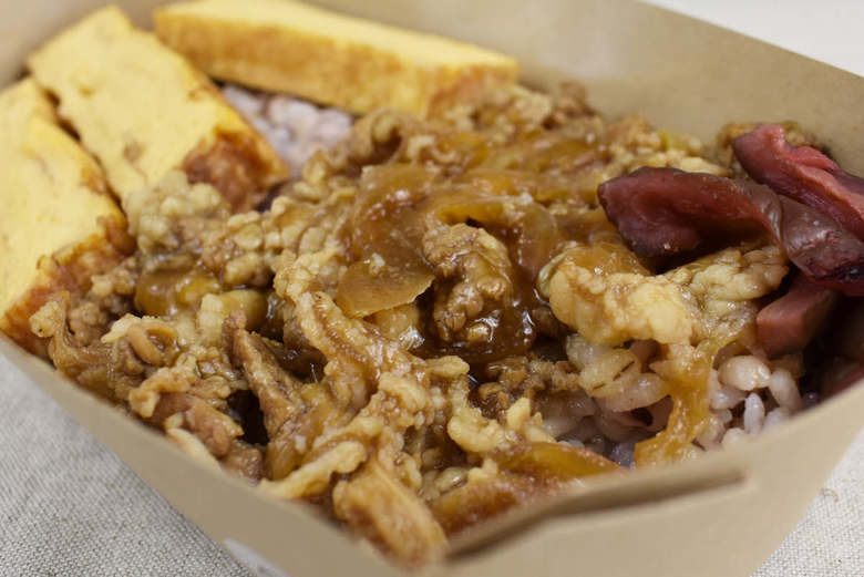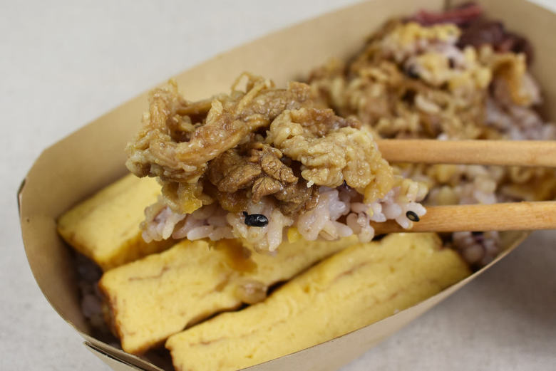 玉子焼の隣には、山椒の香りをまとわせた牛肉と玉ねぎが。どちらも醤油やみりんでしっかり煮込まれているようです。おかずの下には、紫色の十六穀入りご飯がたっぷり敷き詰めてありました。