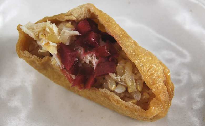 オーソドックスなものは油揚げと米の組み合わせですが、ナチュラルローソン「焼さば玄米いなり寿司 3個入」には“さばのほぐし身”をトッピング。また野沢菜やゆず、カリカリ梅がいなりに盛りつけられており、彩りも鮮やかです。