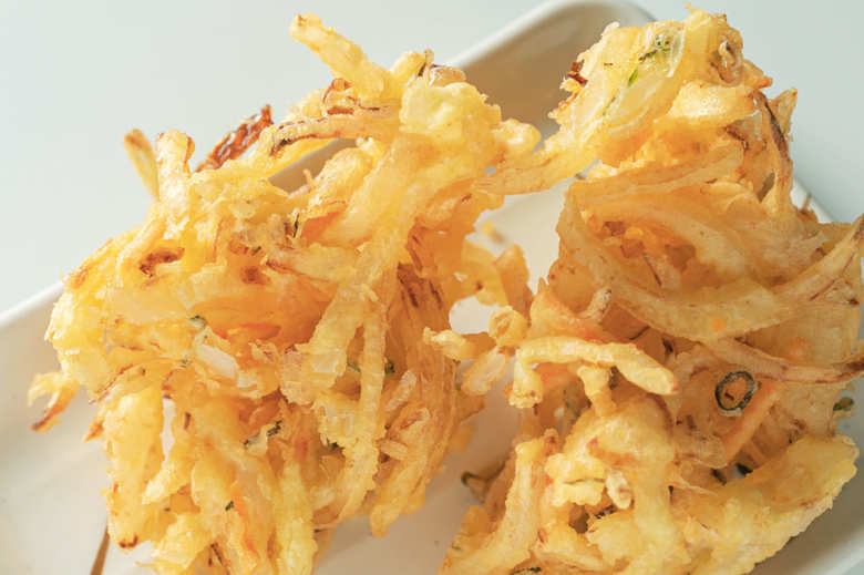 にんじん、たまねぎ、さつまいも、青ねぎと、4種類の野菜が入った野菜のかき揚げ。特筆すべきは、なんといってもボリューミーなサイズ感!子どものこぶし大くらいはあります。