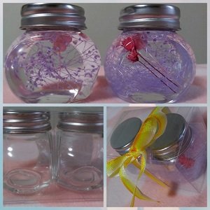 ハーバリウム作りをする前に、瓶はしっかり清潔な状態で使用します。キッチンペーパー・・・オイルがこぼれた時用に便利花はブリザードフラワーを使用