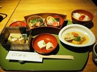 無事作品を完成させた後は、バスで金閣寺周辺へ移動して、かわいいビストロでランチを頂きました。京都に来たら京料理!といきたいところですが、そういうお店は混んでいるので待ち時間がもったいない!と、地元の方が利用しそうなお店を選び、待たずに日替わりランチを頂いてから店を後にしました。 この後は、数回京都をリピートしながらも訪れたことが無かった金閣寺を拝観することに。さすがに金閣寺は美しいだけあり国内外の観光客の皆様で混みあっていましたので、スピーディーに敷地内の写真撮影を済ませて早めに退出(要は押し合いへし合いによる着物の着崩れを恐れた訳です)。一旦バスで京都駅前まで戻り、宿泊するホテルへチェックインしました。 そして17時過ぎにホテルから高台寺に出発。今回も移動にバスを使い、夜咄開始の15分前には高台寺到着。この後受付を済ませて、高台寺前の食事処「羽柴」にて点心の夕食を頂きました。(『点心』とは、茶の湯の食事の事で、茶懐石がお弁当になったものを言うそうです。)この夜咄という茶会ですが、茶席でのお茶とお菓子の他、点心と喫茶、拝観料も参加料に含まれていて満足感が高いのです。点心は男性には若干物足りないかと思いますが、女性なら精進料理が色々盛り合わせられている点心は、夕食として満足できる量と味だと思います。 点心を頂いた後は、隠れ家的な喫茶店「いし堀」にてコーヒーを頂きました。こちらの喫茶店では京都の湧き水でコーヒーや紅茶を入れているそうですが、点心の後の美味しいコーヒーというのもなかなか良かったです。
