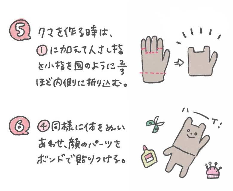 100円ショップなどで買える冬用の手袋の、中指・薬指・手首を内側に折り込んで写真右側のベースの形を2つ作り、上下に組み合わせるだけ! 中に入れる綿なども必要ないので、とても手軽に作れます。
