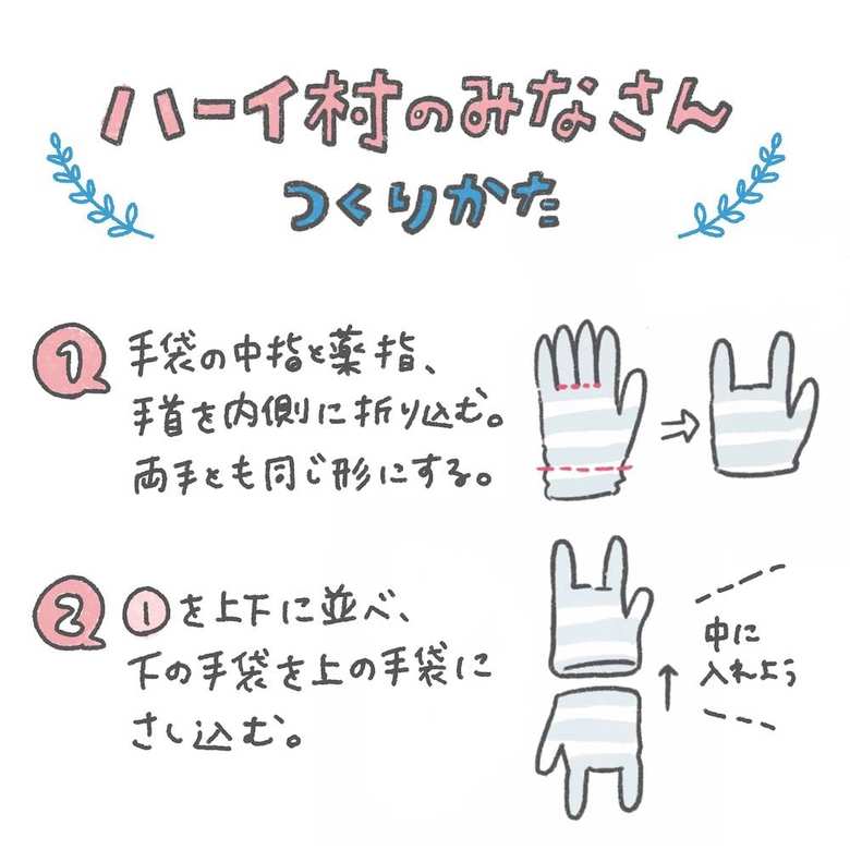 手袋の色や柄、素材やサイズを変えるだけで個性が出るのも「ハーイ村のみなさん」の楽しいところ。どんな子にしようか、どんな子になるのか考えながら手袋を選ぶのもわくわくしますね。