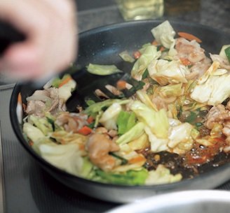 「お料理セット」は野菜がカットされた状態で届くので、ざっとフライパンに入れるだけでOK。調味料も合わさった状態で届くから、ものの数分で作れる。