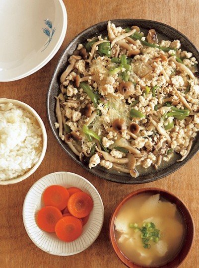 マーボーきのこ春雨&スイートキャロット、「よせとうふ」のみそ汁が完成。「これで2人前だけど、ボリュームたっぷりだから、家族で分け合っても十分満足できますね」