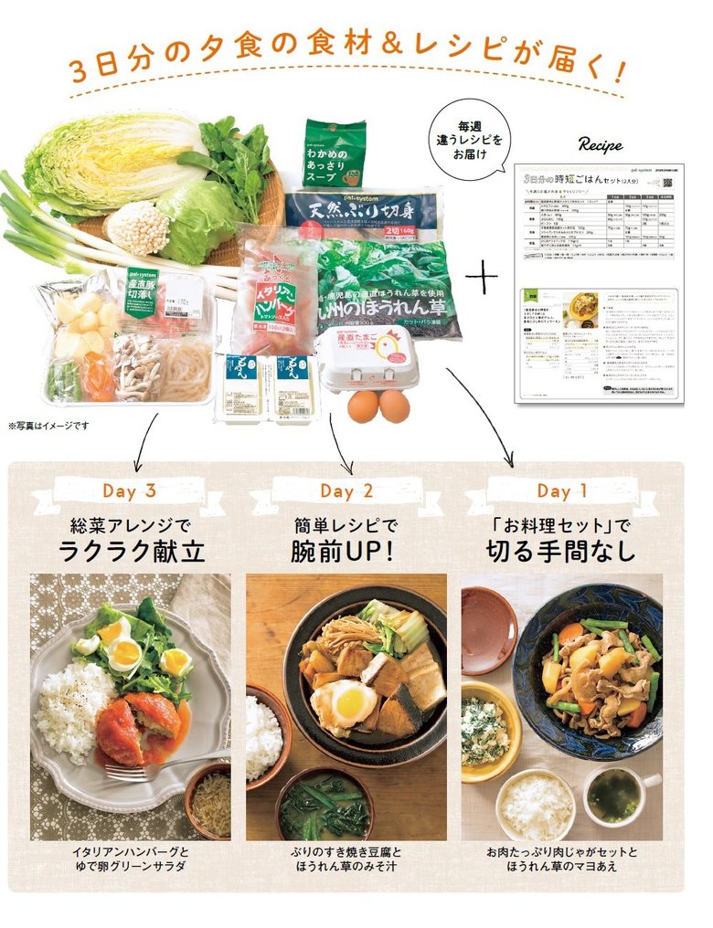 働くママにとって、夕方以降は時間との勝負。「3日分の時短ごはんセット」があれば、帰宅後、すぐに調理に取りかかれるうえ、主菜ともう1品がそろった献立が作れて家族も満足。
