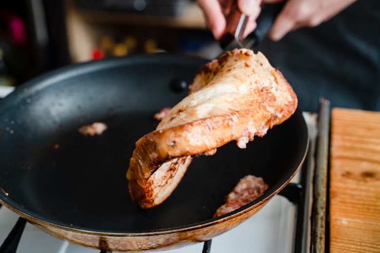 片面が焼けたら、丁寧かつ、大胆にひっくり返します。「エイッ」