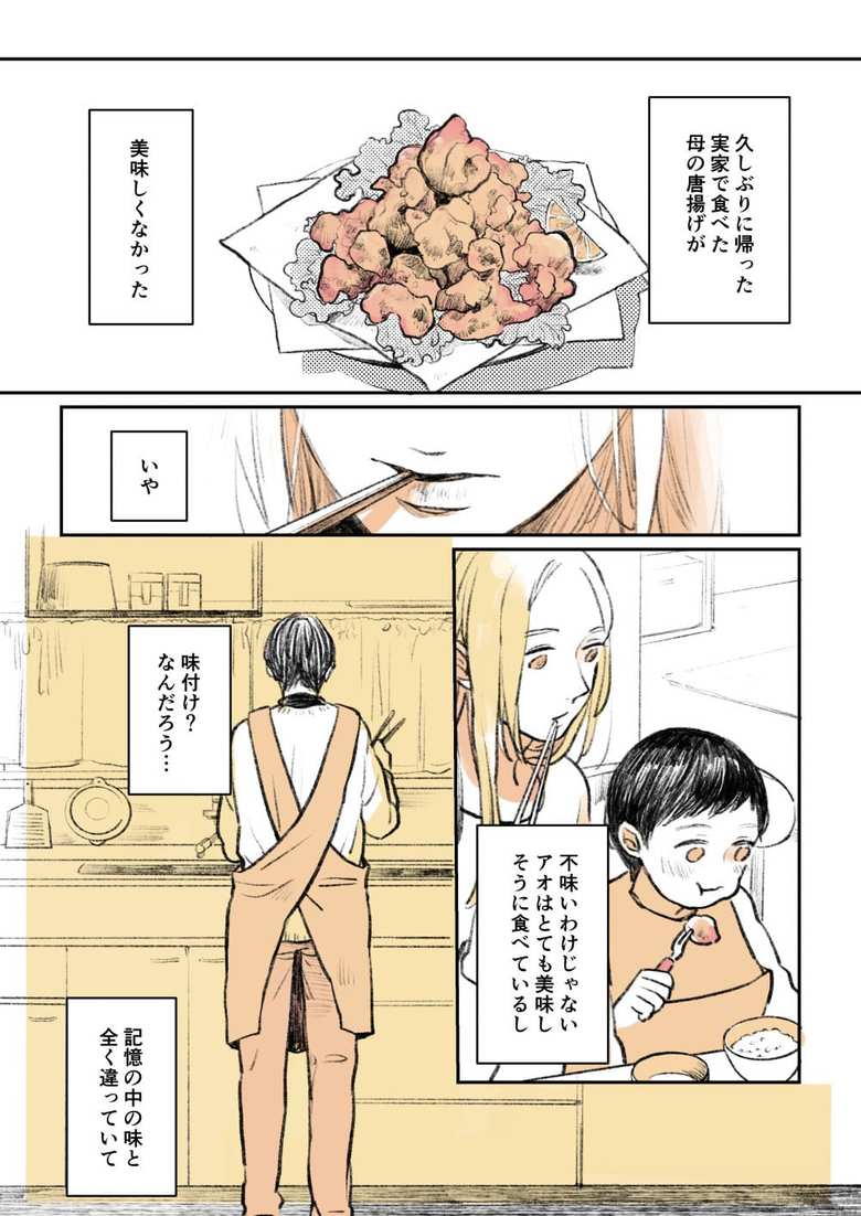 連載トップへ戻る 母の唐揚げが記憶の中の味と違って美味しくなかった理由 つまさき 4コマ・漫画 2021.03.12 続いていく日々の、いつも隣にある食事。大切な人と笑い合って食べる時間が積み重なって、かけがえのない思い出になる。 マイペースな主婦・つくしと、おおらかな夫・コージ、しっかりものの息子・アオ。食べるのが大好きな家族の記憶に残る一皿とは? 漫画を読む 第3話「母の唐揚げが記憶の中の味と違って美味しくなかった理由(前編)」 作/つまさき この記事の写真をすべて見る(4枚)