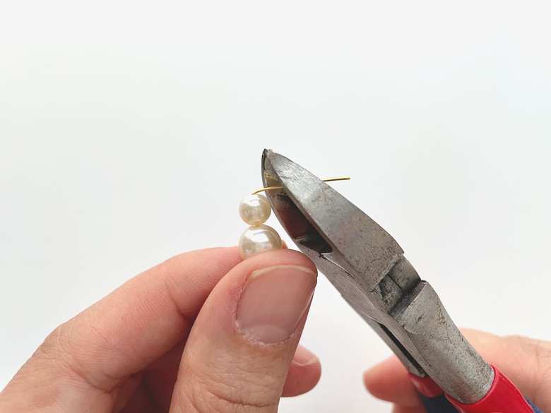 直径6mmのパールパーツの上のところでTピンを90度に曲げ、7mmほど長さを残してニッパーで切ります。