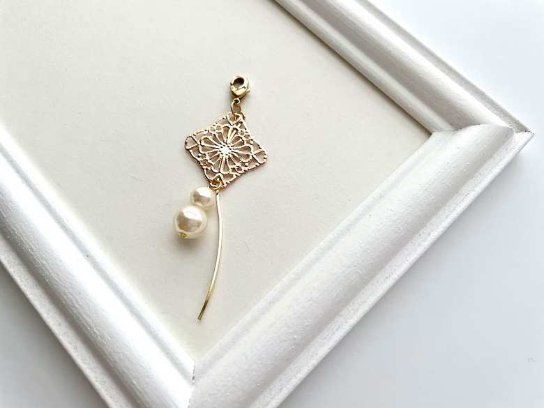 次に作るのは、透かし彫りパーツとパールを使ったマスクチャームです。パールとスティックパーツが揺れる優美なデザインです。