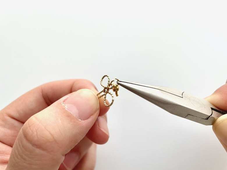ある程度丸まったら、透かし彫りパーツの端にTピンを通し、輪を閉じます。