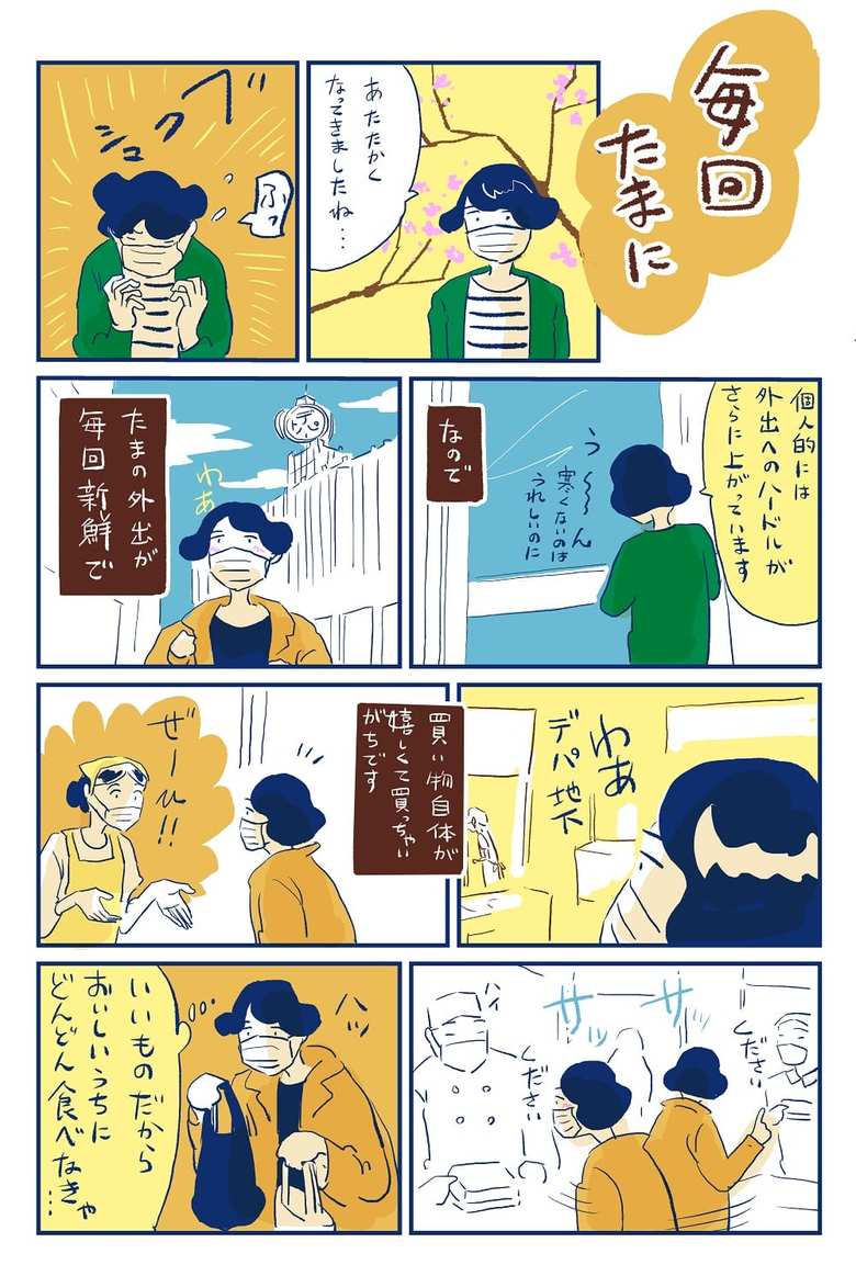 外出もあまりしないので、ちょっと華やかな場所に浮かれる気持ちもあります。子供の頃お祭りでお小遣いを使い果たした時の気持ちに似ています。ただし買ったのが加工肉類と漬物と和菓子なので、そこには中年らしさが全開です。マスクをしているし一人なのでわかりづらいですが、だいぶ楽しかったです。