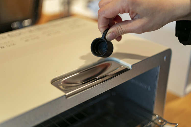 スチームで熱をまわすために、使用時にはトースター上部の吸水口から付属のカップ1杯の水を入れてトーストします。この工程が、トーストの仕上がりを劇的によくするヒミツ。あとは、焼くだけ!