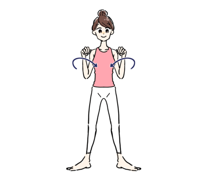 ①足を肩幅に開き、肘を軽く曲げる。 ②リュックサックを背負うようなイメージで、両腕を内側へ回す。 ③上着を脱ぐようなイメージで、両腕を外側へ回す。