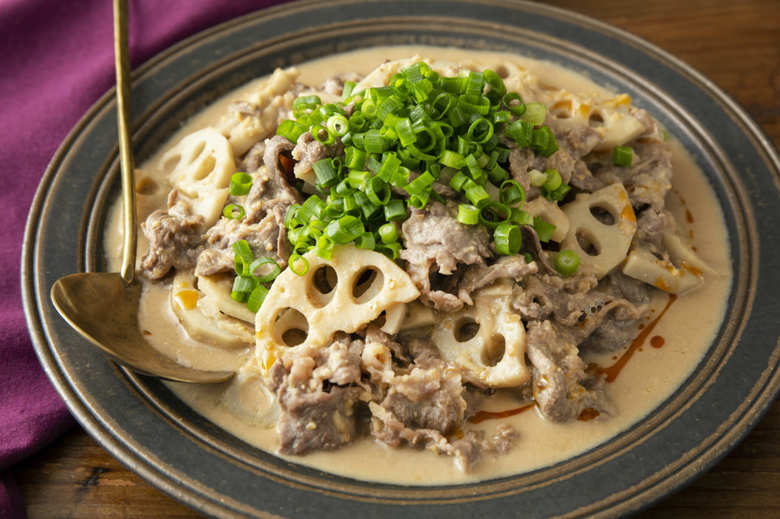 柔らかい牛肉の旨みと、シャキシャキのれんこんの歯ごたえ、そしてとろっとした坦々風のスープがよく合っていて、止まらなくなるおいしさです。スープはベースの豆乳がとろっとしていてやさしい味わいですが、奥深さも感じられます。最後にラー油を回しかけるとパンチがプラスされて、さらにおいしく食べられますので、大人の方にはおすすめです。
