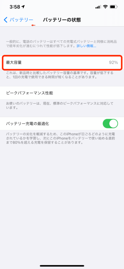 それでもバッテリーの最大容量は使ううちに少しずつ減っていきます。この最大容量が80%を切ってきたら、そろそろバッテリー交換を検討する時期です。