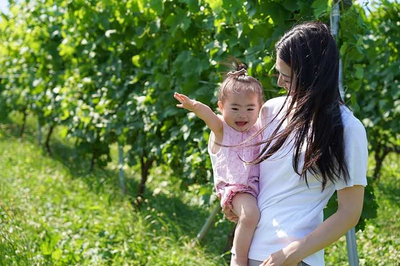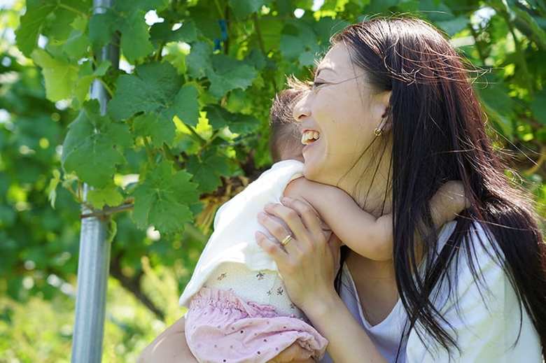 幸い我が家はぶどう園なので、お散歩には困らない。ベビーカーに愛子を乗せて、息子がベビーカーを押して畑をお散歩すると、ガタガタ道ですぐに寝てしまうんです。今思い返しても、静かで平和な時間でした。