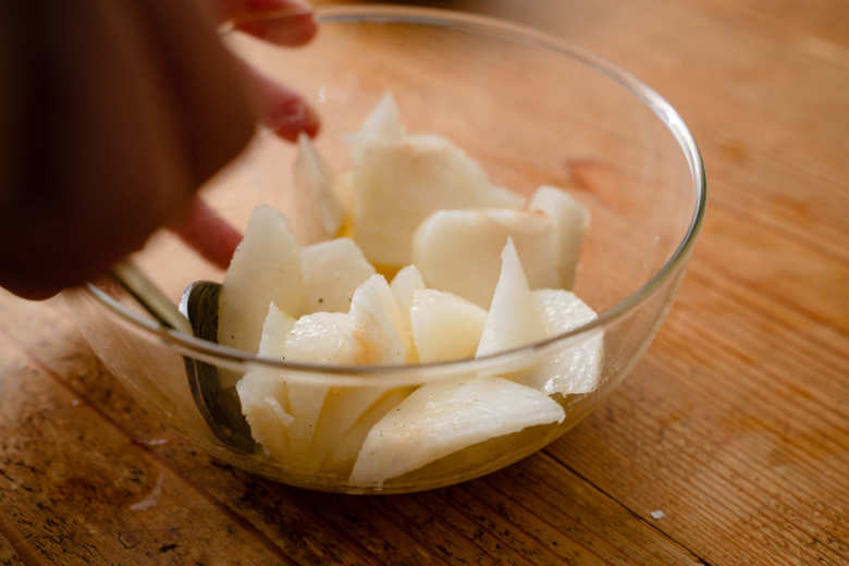 脱線しがちなので急に作り方に戻します。梨は皮をむいて、種を取り、小さいくし形になるように切ります。