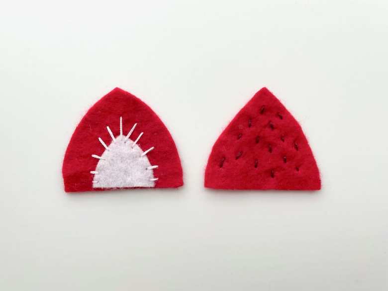 赤いフェルトの1枚に茶色の刺しゅう糸(3本どり)で、種を刺繍します。縦方向に刺していくと種らしさが出ます。