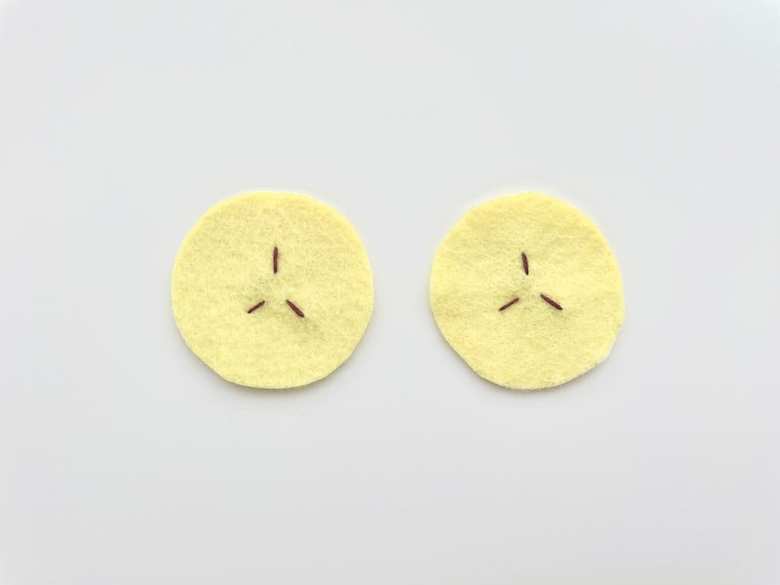 黄色のフェルトの円それぞれにチャコペンで、写真のような線を描きます。茶色の刺しゅう糸(3本どり)で描いた線を縫います。