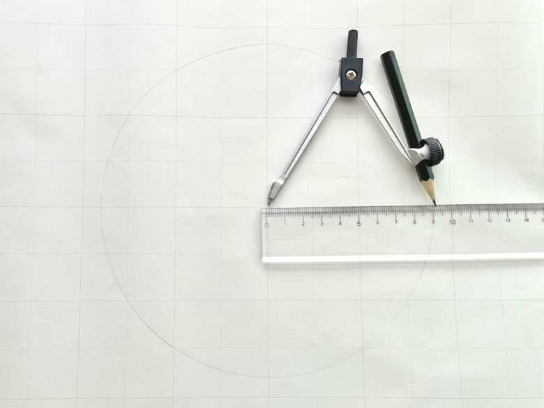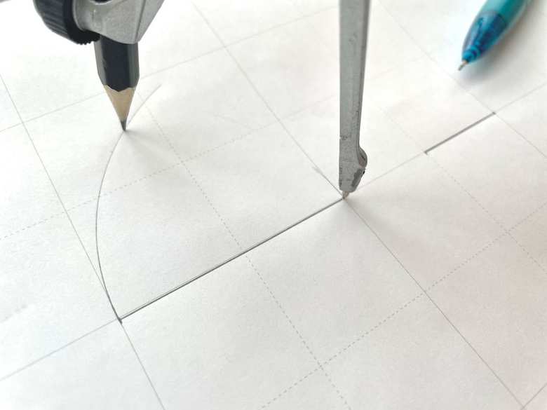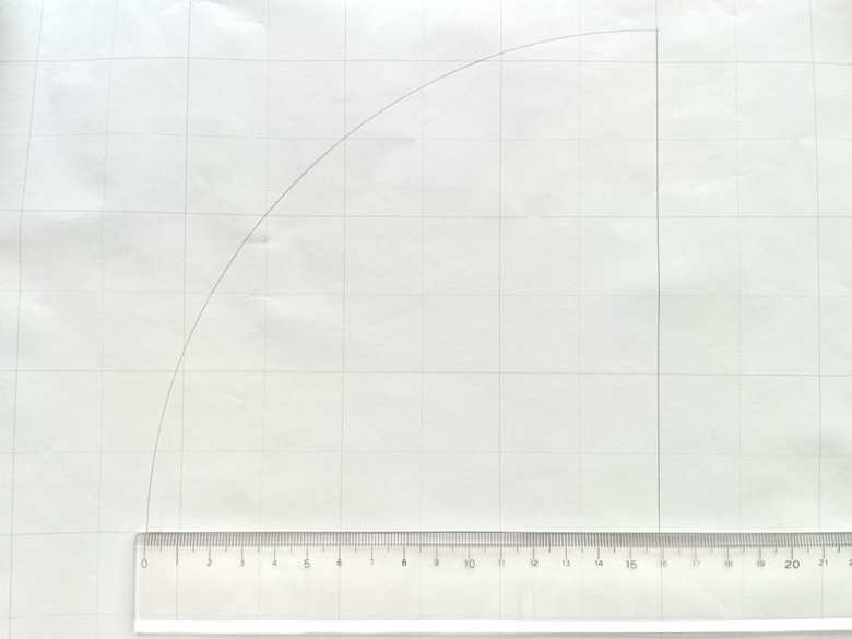方眼紙に、半径16cmの1/4の円を描き切り取ります。