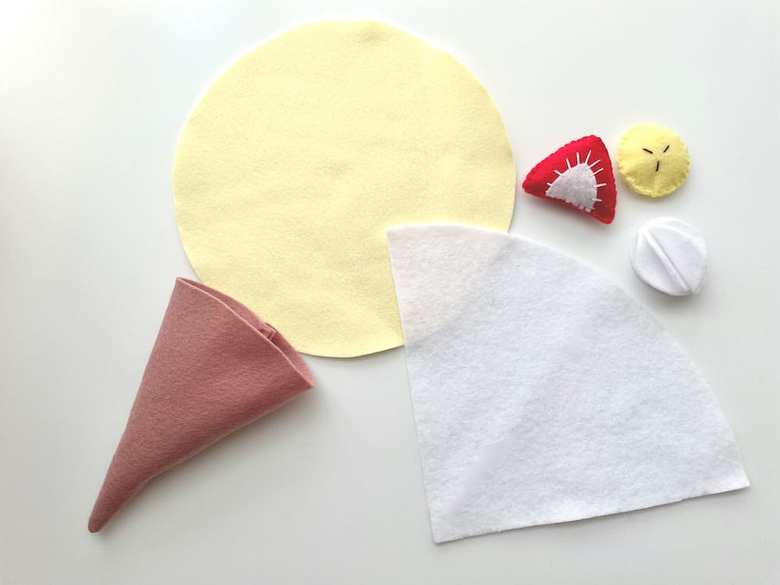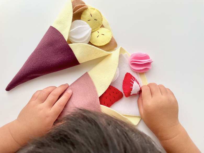 バナナといちごの数を増やしたり、クリームのフェルトを茶色に変えてチョコクリーム、ピンクに変えていちごクリームにするとさらに遊びのバリエーションが広がりますよ。お子さんとクレープ屋さんごっこを楽しんでくださいね!