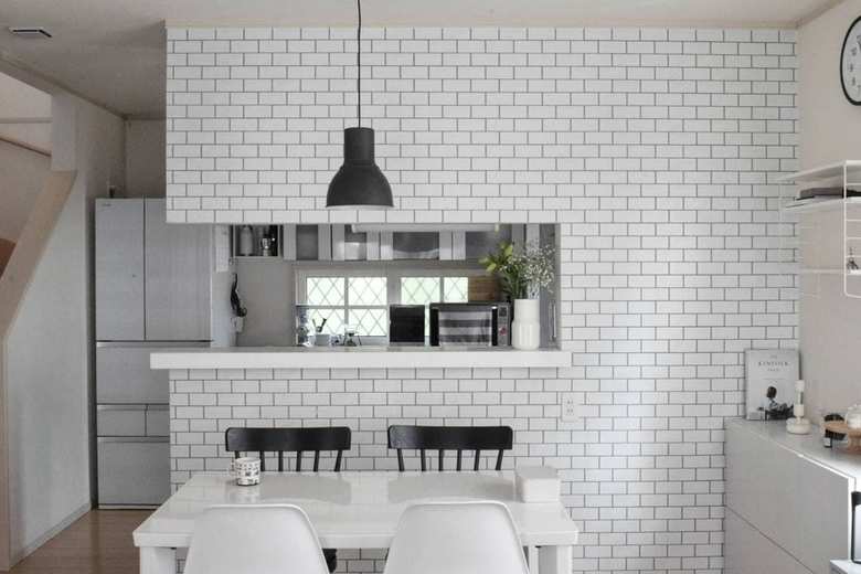あこがれのスタイルに近づけるために、asamiさん自身でリフォームしてきました。 白一色だったキッチンカウンターの壁も、壁紙屋本舗のレンガ風の壁紙を使用し、外国のダイニングのような雰囲気に変身。