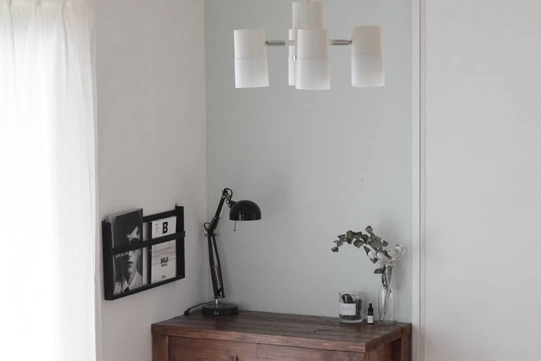 和室の一角はパソコンやミシンを使うワークスペースに。IKEAのデスクライトをはじめとしたちょっと男前なインテリアが、白とグリーンの爽やかな雰囲気をぐっと引き締めています。