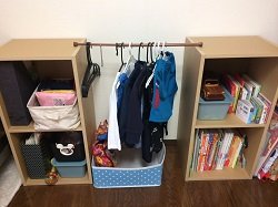 材料 ・突っ張り棒 ・カラーボックス はい、これだけです。もともとあったカラーボックスを2個隙間なしに並べて設置し、子供のおもちゃや絵本を収納していました。 園に通うようになって、制服やカバン、小物などを収納する場所が必要になりました。棚を買い足すのは簡単ですが、長い目でみて、いずれ使わなくなるのであれば簡易的なものでよいと思いました。それに子供が自分自身で、着替えやカバンを片づけてもらう為にもシンプルなものが良いなと思いました。 扱いやすいように子供の身長の高さに合うカラーボックスなので、ハンガーを掛ける、取るの作業が簡単にできます。 通常突っ張り棒は、壁と壁に付けてしっかり固定するのですが、洋服をたくさん掛けてしまうと、ずれ落ちてしまう事が多々あります。 このように、上に置いただけですが、両端をささえられているので、通常より重さがかかっても落ちないです。たくさんハンガーをかけたり、カバンも掛ける事ができます。はじを可愛いマスキングテープで貼るとより固定されます。私は、見た目がすっきりしている方が好きなので、テープでも止めていませんが、子供が雑に扱ってしまっても、ずり落ちることなく使えています。 カラーボックスとの空間の幅は、約50cmあります。高さは約70cmなので、大人用の服を掛けると、下に裾がついてしまいます。カラーボックスを90cm位の高さにすると大人用にもなるので、ちょっとお客様がいらっしゃるときにかけてもらったり、よく着る洋服を掛けたりと、使い道があるので、ぜひ作ってみて下さい。