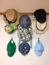 材料は、すべて100円ショップで購入できるものです。一度は買ったことがある材料ではないでしょうか?我が家では、配置換えをしたため、使えないで余っていたものがあるので、今回は費用は発生しませんでした。どこの家庭にも一つはあると思いますが、使わないでおいてあるものがあったら引っ張り出してぜひ、参考にしていただければと思います。 和室がないお宅では、鴨居に掛ける事ができませんが、他の方法としては、クローゼットの中にワイヤーネットを吊るしたり、ピンフックを使ってひっかけたりが可能です。本棚やチェストの上にのせて壁に立てかけるのも良いかと思います。 帽子は、たくさん購入したり、もらいものだったりで、意外と量があってかさばるものです。それにキャップやストローハット、ベレー帽などいろいろな形があります。ワイヤーネットに掛けて収納する事で、形も崩れにくく、子供用の帽子でサイズアウトして使わなくなっても、フックの位置をかえるだけで何通りも掛ける事ができます。 特にお勧めなのはストッパー付きS字フックです。ワイヤーフックにかけても、はずれないのはもちろん、ワイヤーネットにも動きにくいです。簡単に取り外しができます。両親の帽子も掛ける事ができるので、共通の帽子掛けにもなります。