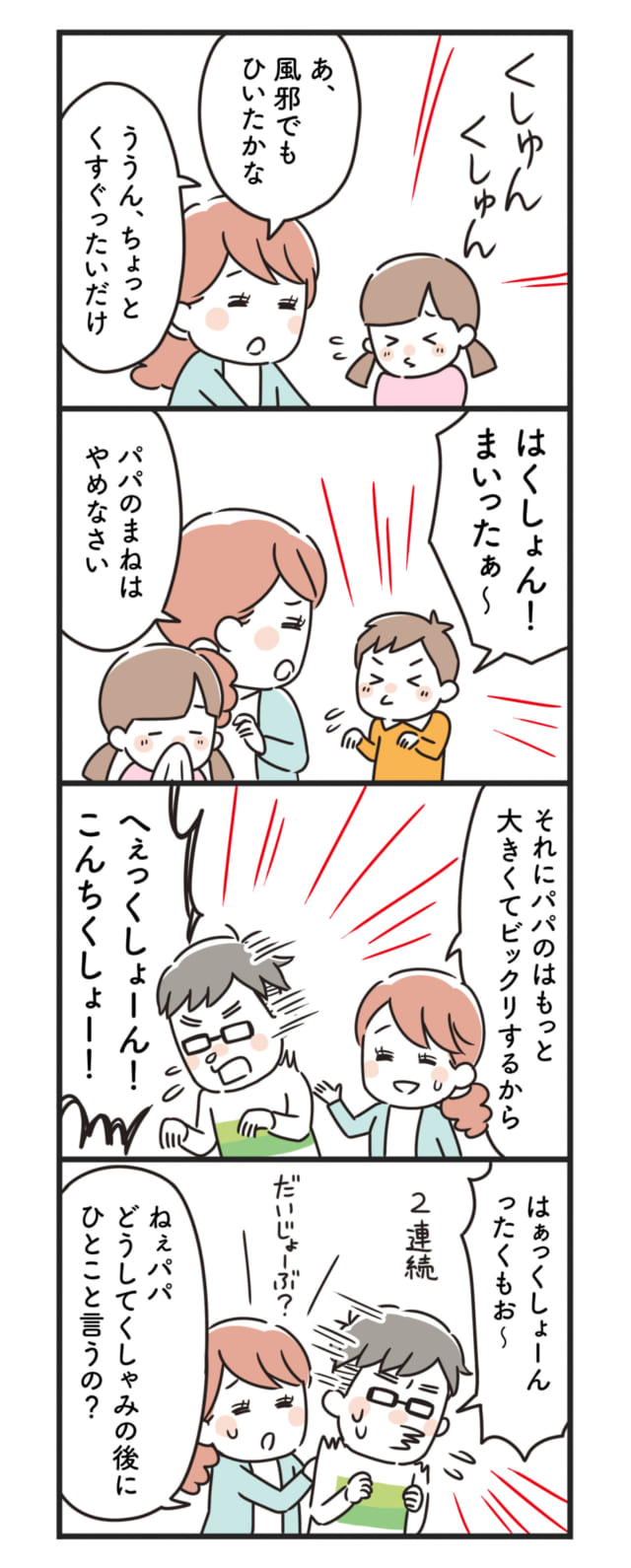 くしゃみのあとに、ひと言言わずにはいられないトシオ。そのクセが不思議でしかたなかったマミですが、どうやらウメコに影響されているようで…!?