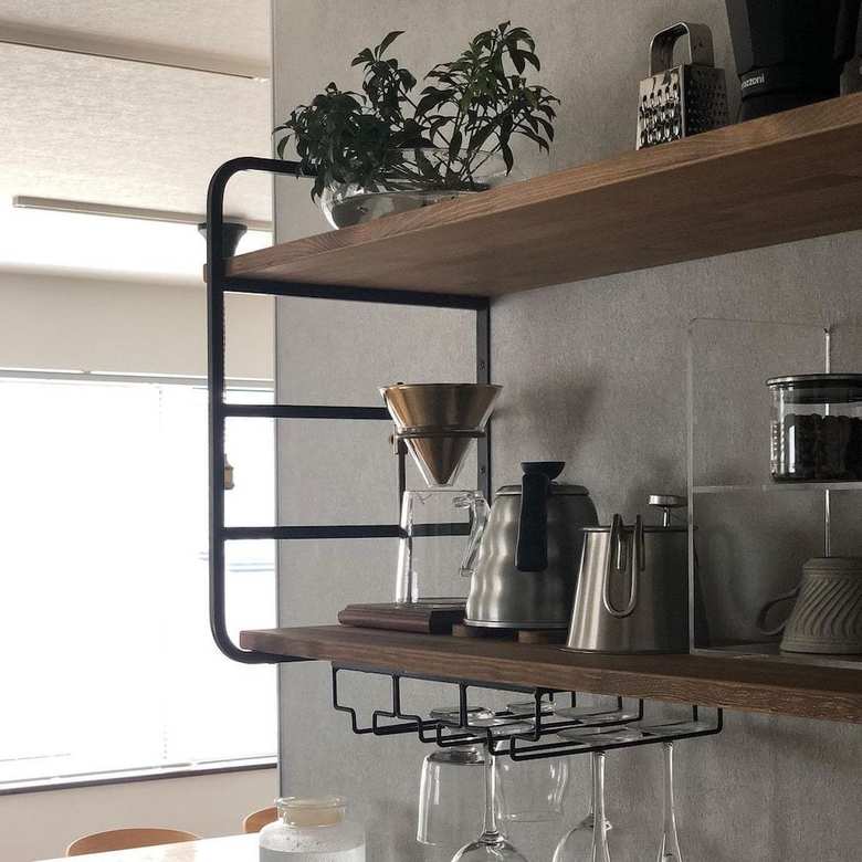 キッチンのオープンシェルフは、京都にある雑貨店・オルネで購入したシェルフに、La Paulグラスホルダーを取り付けたもの。飾り方にもルールがあります。