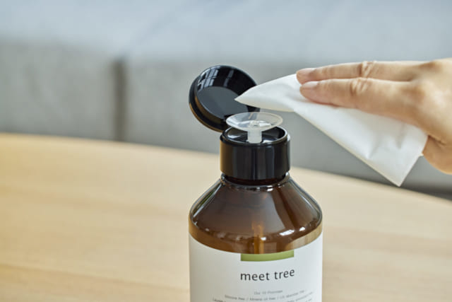 ポンプ部分にティッシュやキッチンペーパーなどを押し当て、液を含ませてテーブルや物などを拭き取り、気軽に除菌が可能。嗅覚を捉えるウッディかつ爽やかな香りがとっても心地よく、心も落ち着きます。