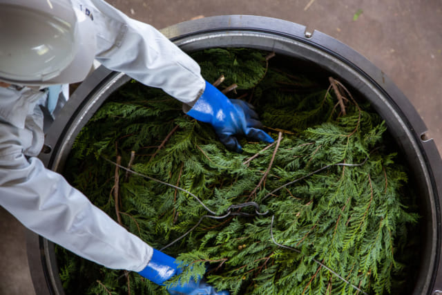 先述したように、木材はさまざまな用途で使われているうえ、特に木曽ヒノキの幹の部分は製紙用チップやバイオマス発電などでも活用されつつあります。その一方で、葉のほうは山に捨てられてしまっているという現状がありました。