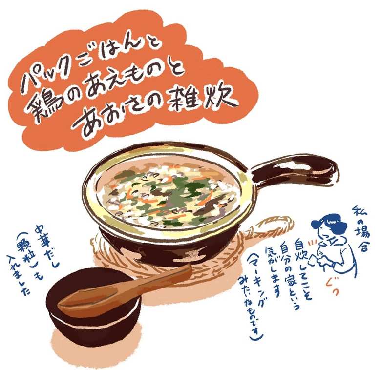 今日のあのにめし「パックごはんと鶏のあえものとあおさの雑炊」
