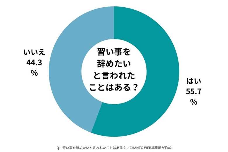 子どもに「習い事を辞めたい」と言われたことがあるか聞いたところ、「はい」と回答した方は55.7%。全体の5割強を占める結果になりました。
