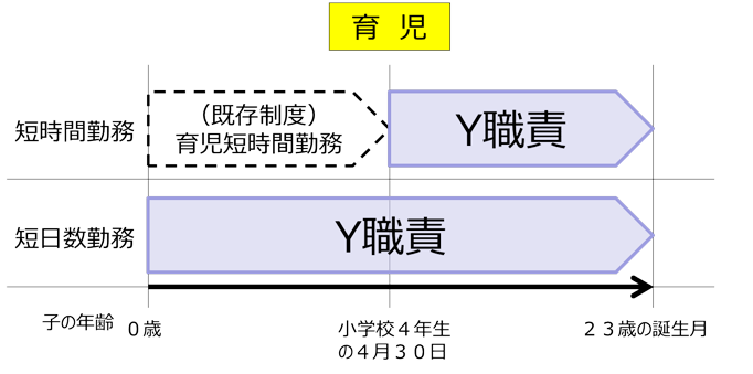 弊社の育児短時間勤務制度は、子どもが小学校4年生になった4月末まで利用できるのですが、Y職責の場合、子どもが23歳になる月までY職責の対象となります。