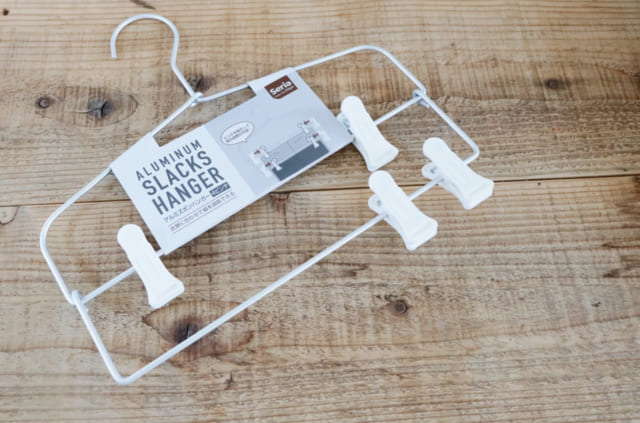 セリアの「アルミズボンハンガー」はピンチの位置が移動できるズボンハンガー。