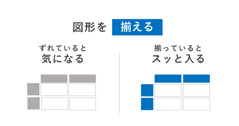 まずは図形やテキストボックスの位置をそろえる方法を紹介します。要素がずれていると、そこが気になって(=ノイズになって)内容に意識が向かなくなります。